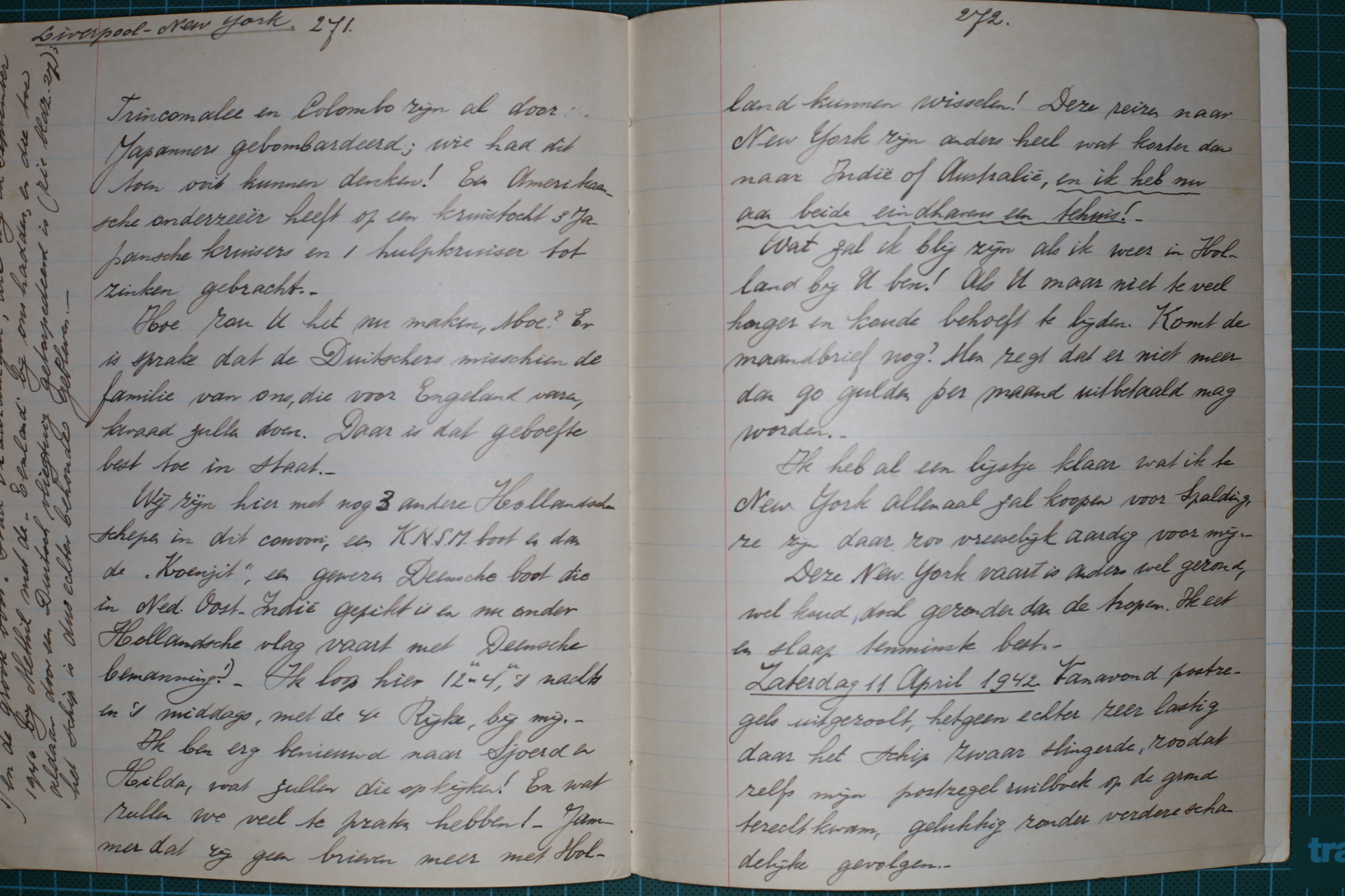 De radio vertelde dat de Engelsen een vliegdekschip verloren hebben, de Hermes van 1924, met veertig vliegtuigen. Trincomalee en Colombo zijn door de Japanners gebombardeerd; wie had dit toen ooit kunnen denken! Een Amerikaanse onderzeeër heeft op een tocht drie Japanse kruisers en een hulpkruiser tot zinken gebracht.