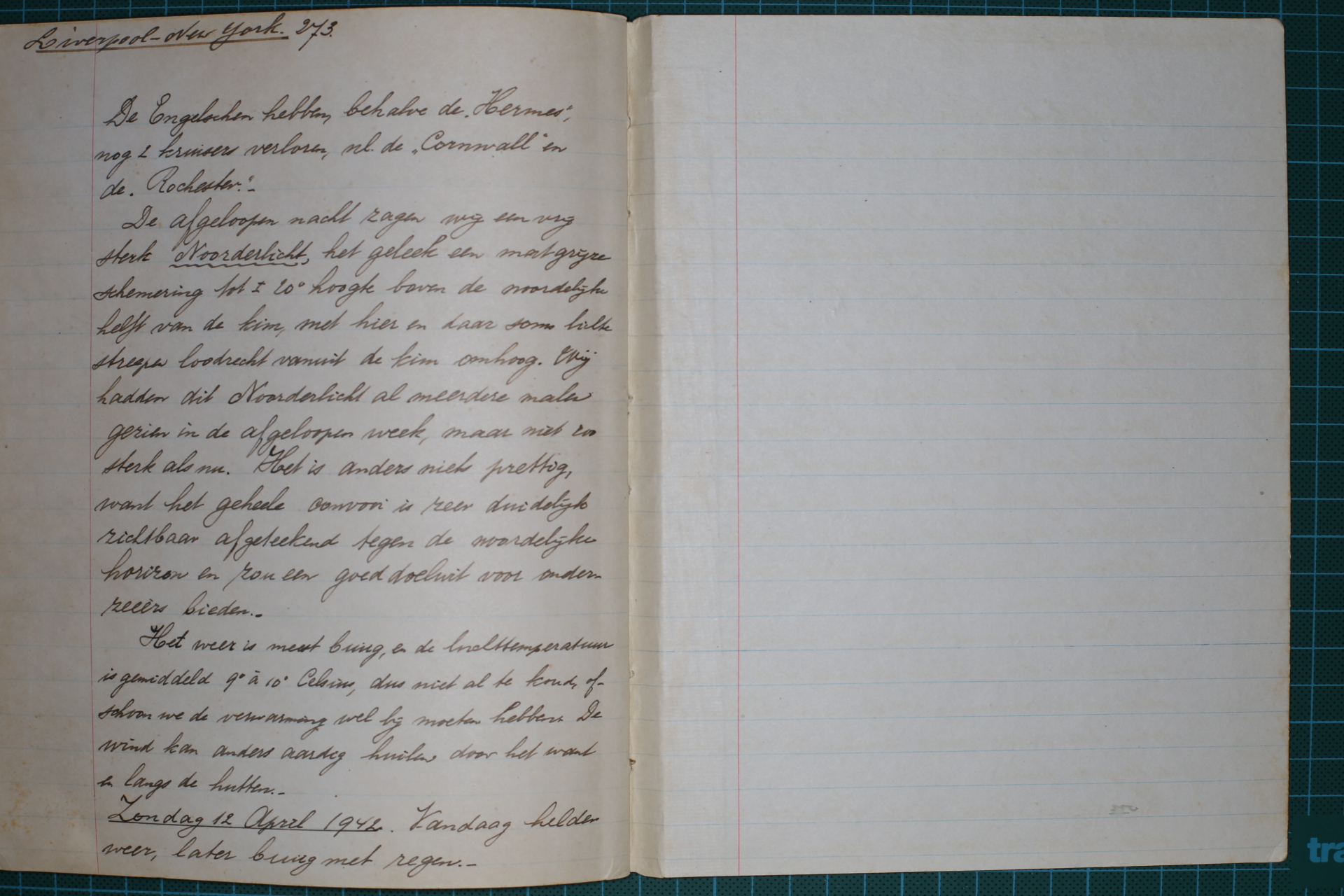 De afgeloopen nacht zagen wij een vrij sterk Noorderlicht, het geleek een matgrijze schemering tot ± 200 hoogte boven de noordelijke helft van de kim, met hier en daar soms lichte streepen loodrecht vanuit de kim omhoog. Wij hadden dit Noorderlicht al meerdere malen gezien in de afgeloopen week, maar niet zoo sterk als nu. Het is anders niet prettig, want het geheele convooi is zeer duidelijk afgeteekend tegen de noordelijke horizon en zou een goed doelwit voor onderzeeërs bieden.- Het weer is meest buiig, en de luchttemperatuur is gemiddeld 9° à 10° Celsius, dus niet al te koud, ofschoon we de verwarming wel bij moeten hebben. De wind kan anders aardig huilen door het want en langs de hutten.-